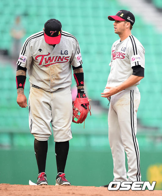 2회말 1사 만루에서 LG 포수 윤요섭의 정비때 마운드를 방문한 조쉬벨이 티포드와 이야기를 나누고 있다.