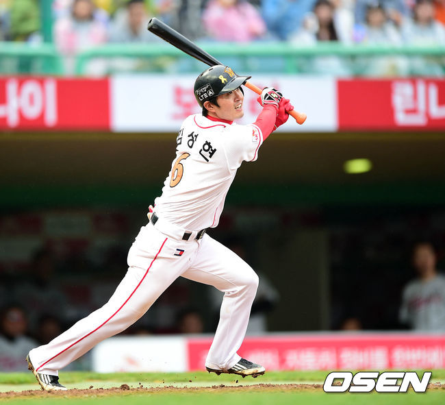 3회말 1사 1,2루에서 SK 김성현이 우전 2타점 적시 2루타를 치고 있다.