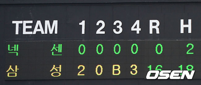 4회말 삼성이 16-0으로 앞서 나가고 있다. 삼성은 3회 11득점을 올리며 전광판에 11을 표시하지 못해 B로 표기되어 있다.