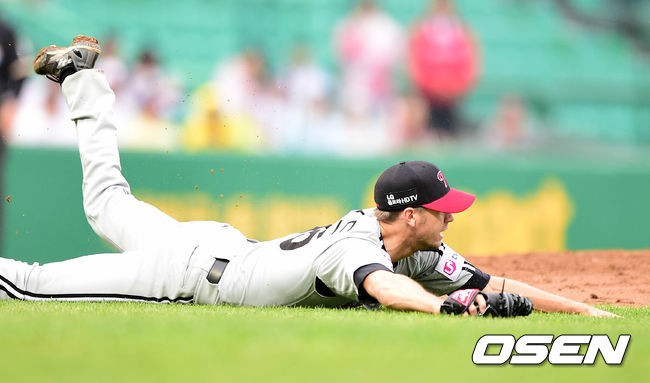 3회말 무사 1루에서 LG 티포드가 SK 임훈의 번트 타구를 잡으려 몸을 날렸지만 놓치고 아쉬워하고 있다.