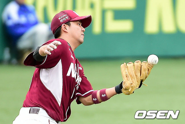5회말 2사 넥센 김민성이 삼성 김상수의 타구를 잡았다 놓치고 있다.