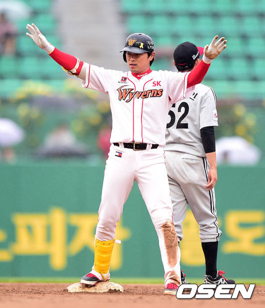 4회말 2사 1,2루에서 SK 임훈이 중전 적시타를 치고 타임을 외치고 있다.