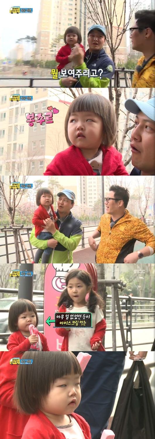 정다윤은 25일 오후 방송된 MBC 예능프로그램 '일밤-아빠!어디가?'(이하 '아빠어디가')에서 아빠의 "봉주르"(?)라는 구호에 맞춰 눈동자를 돌리는 독특한 개인기를 선보였다.
