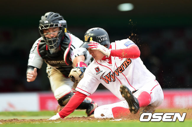 8회말 1사 2,3루에서 SK 박정권의 희생플라이때 3루주자 김재현이 태그업을 시도. 홈에서 득점에 성공하고 있다.