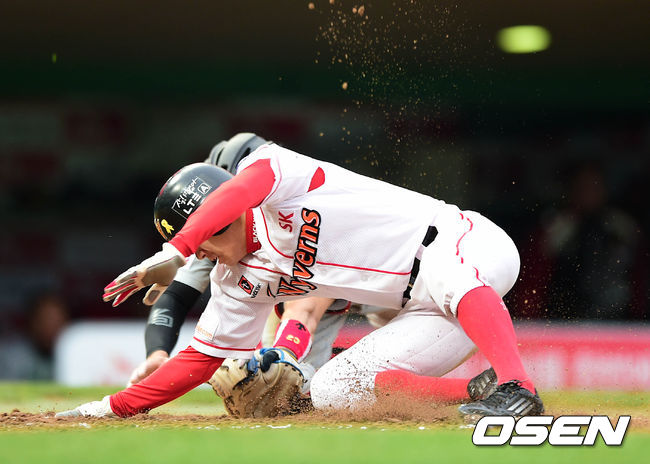 8회말 1사 2,3루에서 SK 박정권의 희생플라이때 3루주자 김재현이 태그업을 시도. 홈에서 득점에 성공하고 있다.