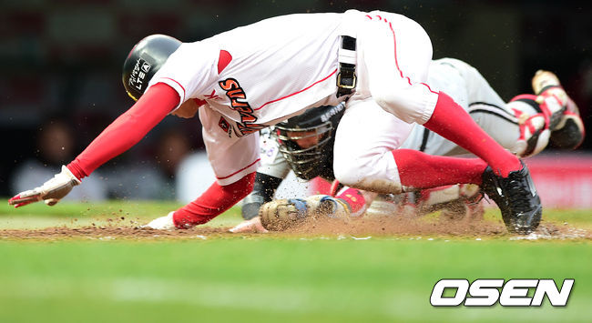 8회말 1사 2,3루에서 SK 박정권의 희생플라이때 3루주자 김재현이 태그업을 시도. 홈에서 득점에 성공하고 있다.