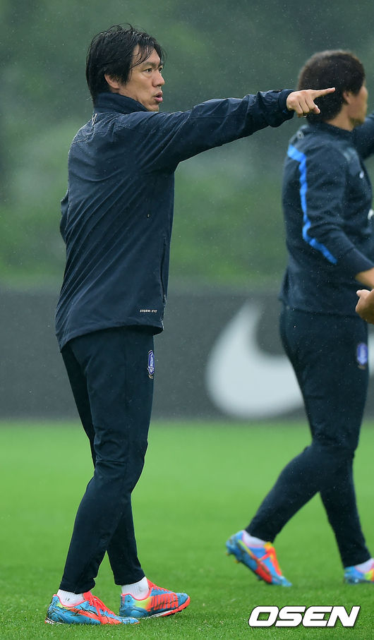 홍명보 감독이 파주NFC에서 훈련 중 지시를 내리고 있다.