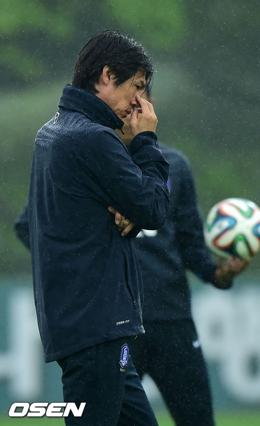 홍명보 감독이 파주NFC에서 훈련 중 생각에 잠겨있다.