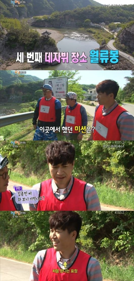 특히 시즌1 멤버 김종민은 미션 장소인 월류봉에 도착해 "생각나는 것이 있느냐"는 질문에 "아무 것도 기억나지 않는다"고 말해 멤버들에 답답함을 안겼다.