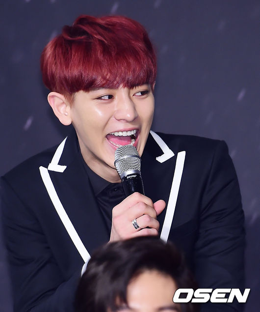 엑소 찬열이 기자회견 중 환하게 웃고 있다.