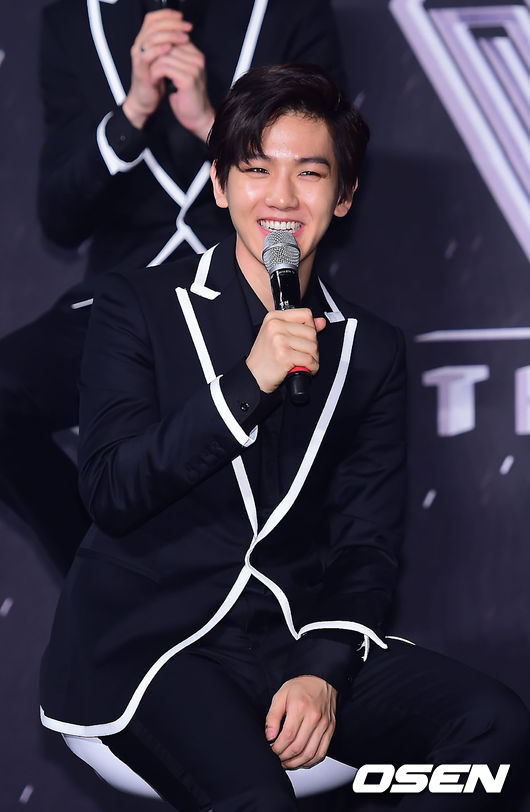 엑소 백현이 기자회견 중 환하게 웃고 있다.