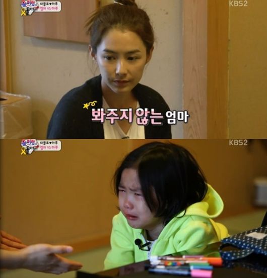 지난 25일 방송된 KBS 2TV 예능프로그램 '슈퍼맨이 돌아왔다'에서는 떼쓰는 하루를 엄격하게 다루는 강혜정의 모습이 그려졌는데요, 강혜정의 카리스마에 하루도 잘못을 뉘우친 표정입니다.