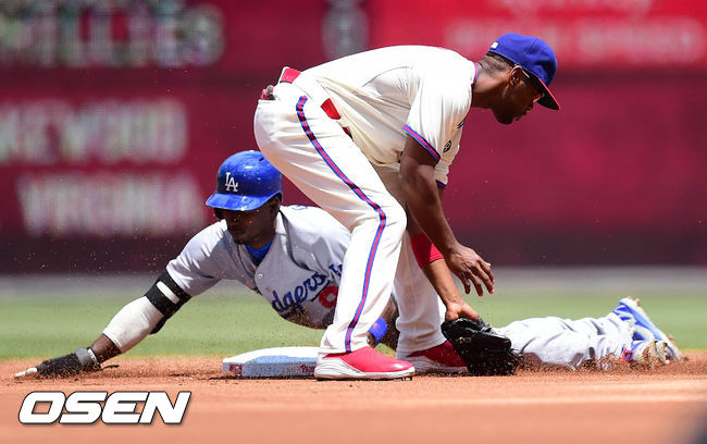 26일(이하 한국시간) 미국 펜실베니아주 필라델피아 시티즌스 뱅크 파크에서 열린 '2014 메이저리그' 필라델피아 필리스와 LA 다저스의 경기 1회초 무사 1루 크로포드 타석, 1루주자 고든이 도루에 성공하고 있다.