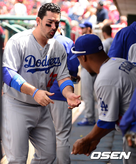 26일(이하 한국시간) 미국 펜실베니아주 필라델피아 시티즌스 뱅크 파크에서 열린 '2014 메이저리그' 필라델피아 필리스와 LA 다저스의 경기 시작전 곤잘레스와 피긴스가 덕아웃에서 장난을 치고 있다.