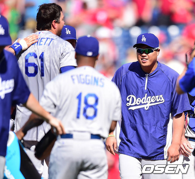 26일(이하 한국시간) 미국 펜실베니아주 필라델피아 시티즌스 뱅크 파크에서 열린 '2014 메이저리그' 필라델피아 필리스와 LA 다저스의 경기 종료 후 류현진이 동료들과 함게 조시 베켓의 노히트 노런을 축하하고 있다.