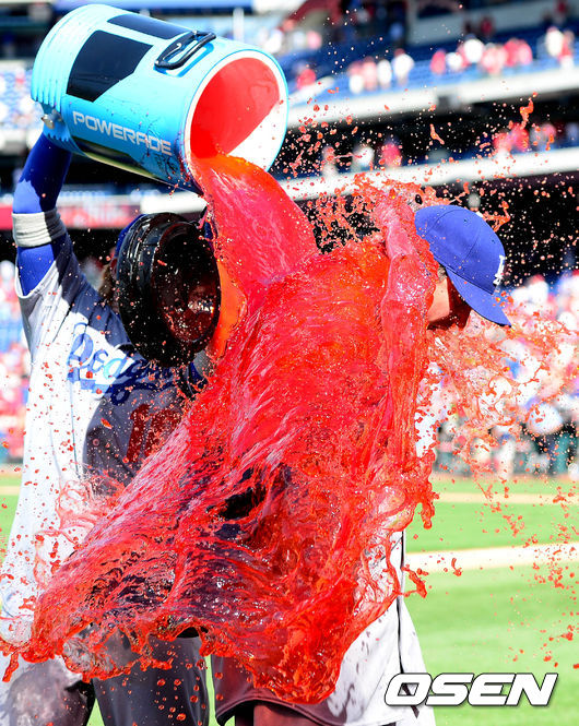 26일(이하 한국시간) 미국 펜실베니아주 필라델피아 시티즌스 뱅크 파크에서 열린 '2014 메이저리그' 필라델피아 필리스와 LA 다저스의 경기 종료 후 조시 베켓이 인터뷰 중 동료에게 음료수 세례를 당하고 있다.