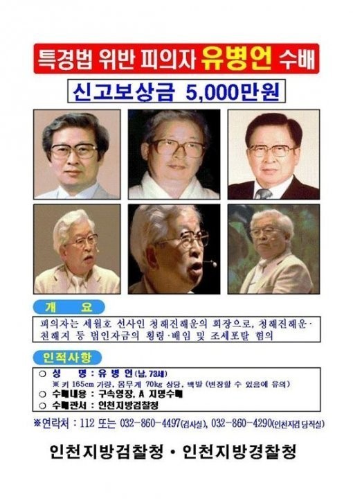 인천지방 경찰청은 25일 유병언 전 회장에게 걸린 현상금을 5억원으로, 유병언 전 회장의 장남 유대균 씨 현상금을 1억원으로 올린다고 밝혔다.