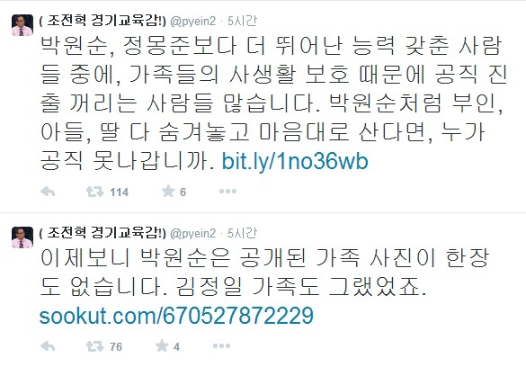 하지만 같은 날 변희재 대표는 "이제 보니 박원순은 공개된 가족사진이 한 장도 없다. 김정일 가족도 그랬다"며 "박원순, 정몽준보다 더 뛰어난 능력 갖춘 사람들 중에, 가족들의 사생활 보호 때문에 공직 진출 꺼리는 사람들 많다. 박원순처럼 부인, 아들, 딸 다 숨겨놓고 마음대로 산다면, 누가 공직 못 나가나"라고 정몽준 후보의 발언을 지지했다.