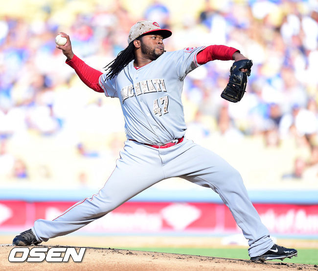 신시내티 선발 조니 쿠에토가 힘차게 공을 뿌리고 있다.