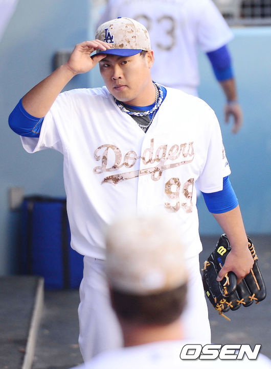 다저스 선발 류현진이 이닝을 마치고 덕아웃으로 들어서고 있다.