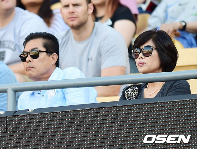 류현진의 부모님이 경기장을 찾아 마운드에 오른 류현진을 응원하고 있다.