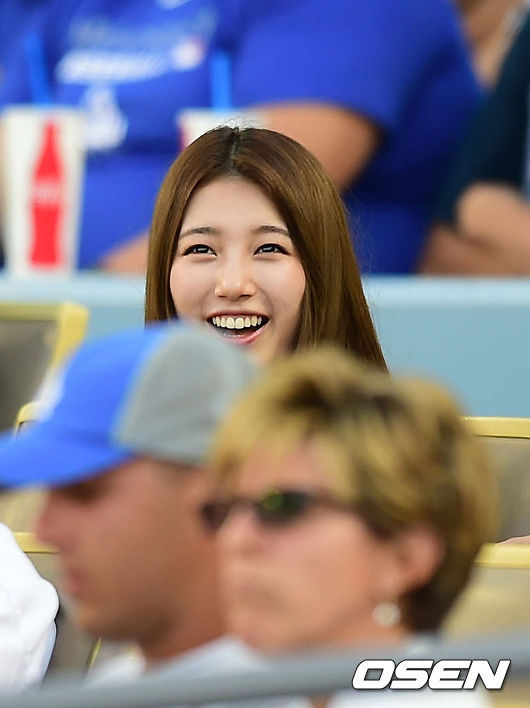 수지는 27일 오전(이하 한국시간) 미국 캘리포니아주 로스앤젤레스 다저스타디움에서 열린 '2014 메이저리그' LA 다저스와 신시내티 레즈 경기에서 모습을 드러냈다. 이날 선발 등판한 류현진 선수를 응원하기 위함인 것.