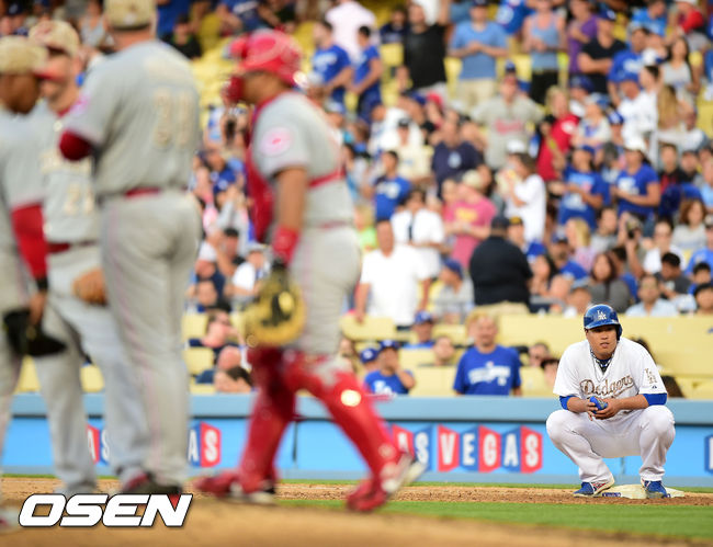 7회말 1사 주자 2,3루 다저스 류현진이 타격, 유격수 실책으로 행운의 1타점을 올린 후 1루에서 휴식을 취하고 있다.