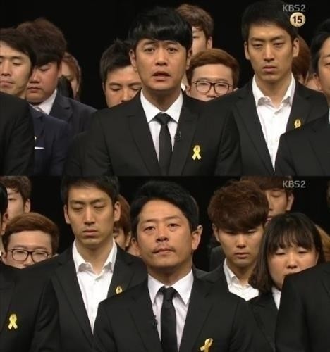 이날 100여명의 개그맨들은 검은 정장과 노란 리본을 가슴에 단 채 무대에 올랐다. 개그맨 김대희와 박성호, 김준호는 제일 앞에 서서 '세월호 참사'로 희생된 이들을 애도하는 메시지를 보냈다.
