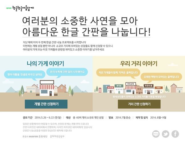 네이버는 캠페인 페이지(http://hangeul.naver.com/sign)를 통해 본인의 가게나 이웃가게들에 얽힌 따뜻한 사연을 신청을 받고 40여 개를 선정하고 한글 간판의 제작부터 설치까지 직접 진행한다.