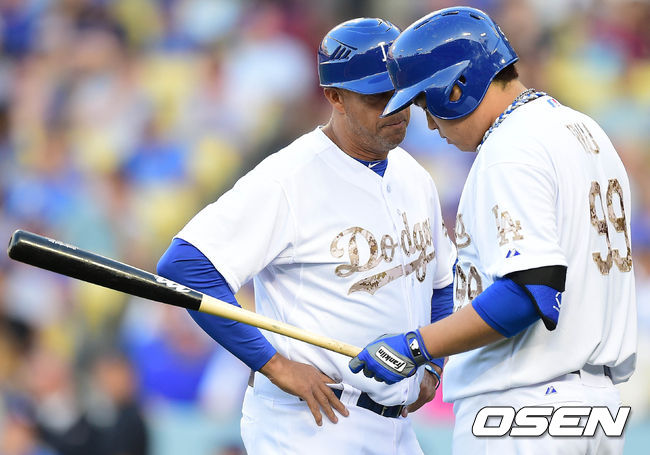 7회말 1사 2,3루 류현진이 타석에 들어서기 전 로렌조 번티 코치와 이야기를 나누고 있다. / baik@osen.co.kr