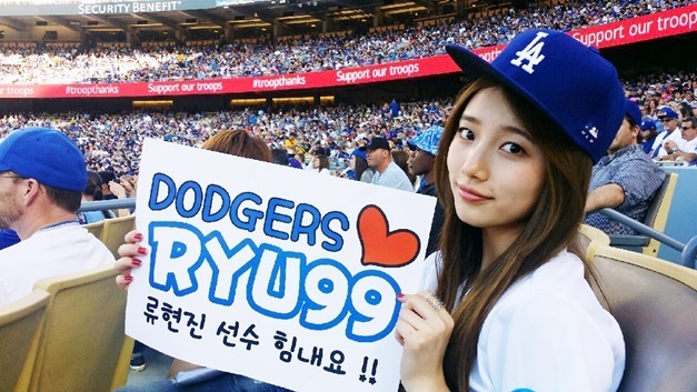 걸그룹 미쓰에이 멤버 겸 배우 수지가 LA다저스 소속 류현진 선수를 응원하는 모습으로 관심을 얻고 있다.