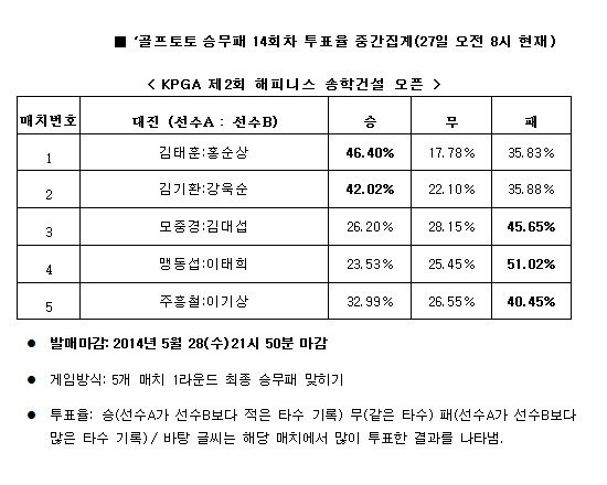국민체육진흥공단(www.kspo.or.kr)이 발행하는 체육진흥투표권 수탁사업자인 스포츠토토 공식 온라인 발매 사이트인 베트맨(www.betman.co.kr)은 오는 28일(수)에 해피니스 CC에서 열리는 ‘KPGA 제2회 해피니스 송학건설 오픈’ 1라운드를 대상으로 한 골프토토 승무패 14회차에서 전체 참가자의 46.40%가 1번 매치에서 김태훈이 홍순상보다 적은 타수를 선보일 것으로 예상했다고 밝혔다.