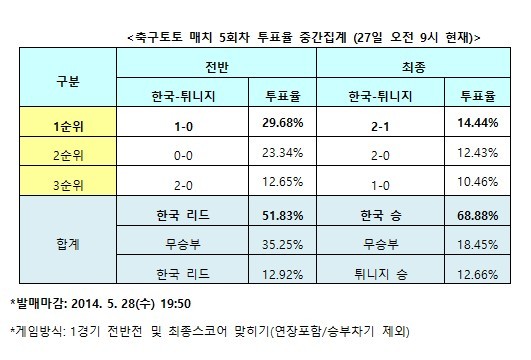 한국-튀니지전 친선경기 대상 축구토토 매치 5회차 투표율 중간집계