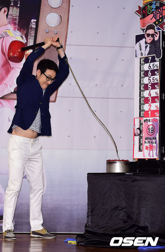 27일 오후 서울 영등포구 여의도동 63 컨벤션센터 3층 주니퍼홀에서 열린 KBS W '1등 우대 토크쇼-시청률의 제왕' 제작발표회에서 이휘재가 해머를 내리치고 있다.