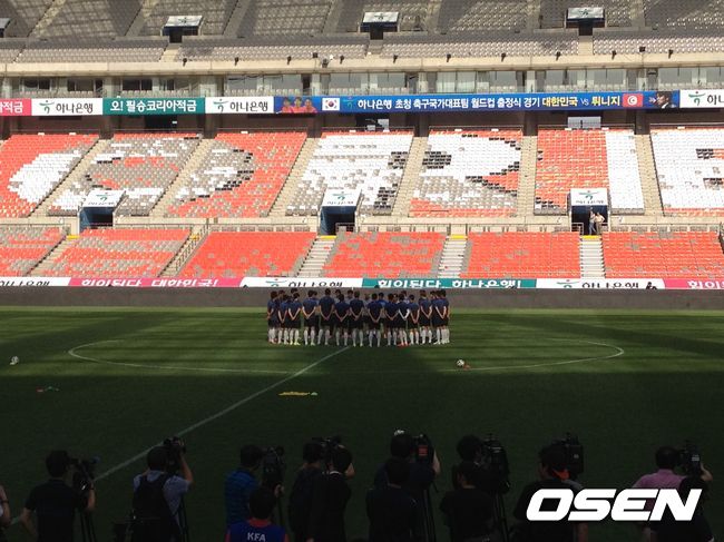튀니지전이 끝나면 2014년 브라질 월드컵 공식출정식이 열린다. 아무래도 튀니지전에서 국민들에게 16강에 대한 희망을 보여야만 기분 좋은 출발이 가능할 것이다. 승패에 신경을 쓰지 않으려 해도 쉽지가 않은 이유다. 이날 서울월드컵경기장은 출정식 준비가 한창이었다. 경기장 관중석에는 카드섹션을 위한 커버가 씌워졌다. ‘We are Korea!’라고 써진 붉은 물결이 월드컵 분위기를 물씬 느끼게 했다.