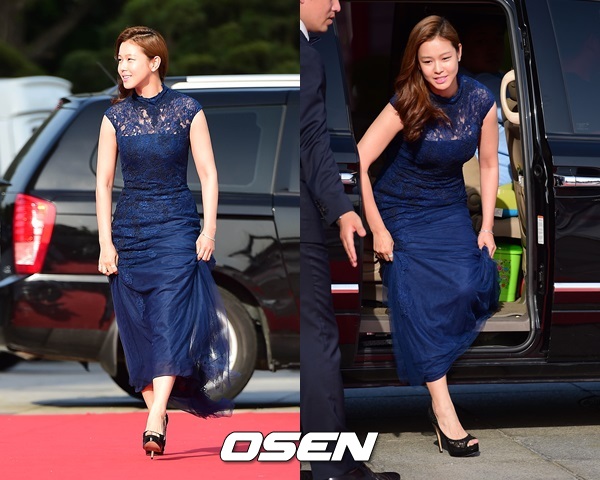 경수진이 선택한 드레스는 푸른빛의 민소매 롱드레스로 가슴 윗부분이 시스루로 디자인 돼 속살을 은근히 노출, 섹시한 매력을 발산하는 것과 동시에 볼륨감 있는 몸매를 뽐내 눈길을 사로잡았다.