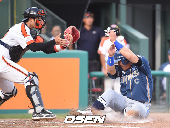 [OSEN=대전,김영민기자] 27일 오후 대전 한밭야구장에서 열린 '2014 한국야쿠르트 세븐 프로야구' 한화 이글즈와 NC 다이노스 경기,1회초 1사 2루 모창민의 적시타때 2루주자 이호준 홈까지 쇄도 득점을 올리고 있다.