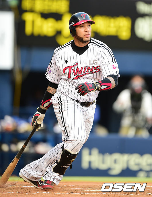 2회말 무사 2루에서 LG 조쉬벨이 선제 적시타를 날리며 타구를 바라보고 있다.
