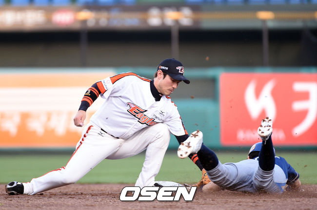[OSEN=대전,김영민기자] 27일 오후 대전 한밭야구장에서 열린 '2014 한국야쿠르트 세븐 프로야구' 한화 이글즈와 NC 다이노스 경기,2회초 2사 1루 이종욱 타석때 1루주자 박민우 2루 도루를 하였으나 태그아웃 처리되고 있다.