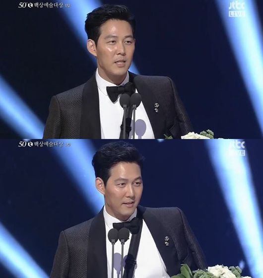 이정재는 수상자 호명 직후 무대에 올라 "팔을 다쳐 수술을 했다. 무거운 것을 들지 말라고 했는데, 상이 무겁다"라고 너스레를 떨어 웃음을 자아냈다.