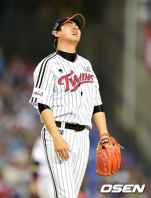4회까지 퍼펙트 게임을 선보이던 LG 우규민이 5회초 무사에서 삼성 최형우에 우전 안타를 허용하며 아쉬워하고 있다.