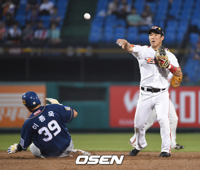 [OSEN=대전,김영민기자] 27일 오후 대전 한밭야구장에서 열린 '2014 한국야쿠르트 세븐 프로야구' 한화 이글즈와 NC 다이노스 경기,4회초 1사 1루 이호준 내야땅볼때 한화 정근우 2루수가 1루주자 이종욱을 2루에서 포스아웃 시키며 1루에 송구 병살아웃 처리하고 있다.