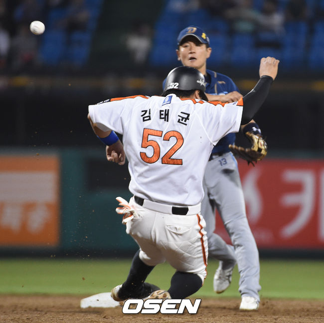 [OSEN=대전,김영민기자] 27일 오후 대전 한밭야구장에서 열린 '2014 한국야쿠르트 세븐 프로야구' 한화 이글즈와 NC 다이노스 경기,4회말 1사 1루 피에 내야땅볼때 손시헌 유격수가 1루주자 김태균을 포스아웃시키며 1루에 송구 병살아웃 처리시키고 있다.