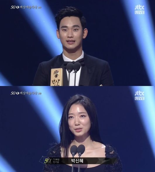 배우 김수현과 박신혜가 제50회 백상예술대상에서 TV부문 인기상을 수상했다.