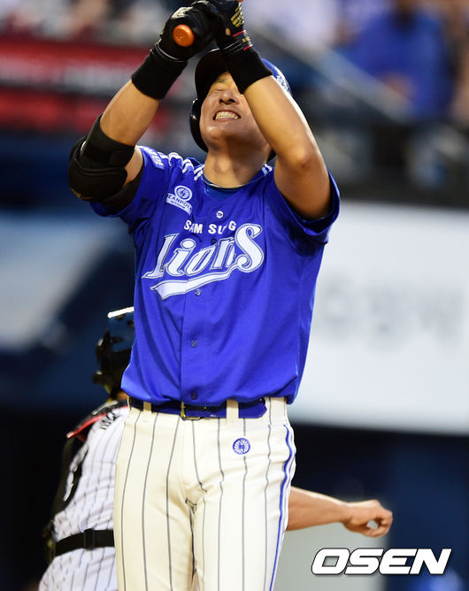 5회초 무사 1루에서 삼성 이승엽이 스트라이크를 놓치며 아쉬워하고 있다.