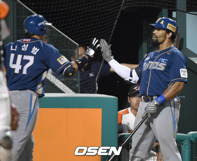 [OSEN=대전,김영민기자] 27일 오후 대전 한밭야구장에서 열린 '2014 한국야쿠르트 세븐 프로야구' 한화 이글즈와 NC 다이노스 경기,5회초 2사 2,3루 나성범 스리런 홈런을 날리고 홈인 테임즈의 축하를 받고 있다.