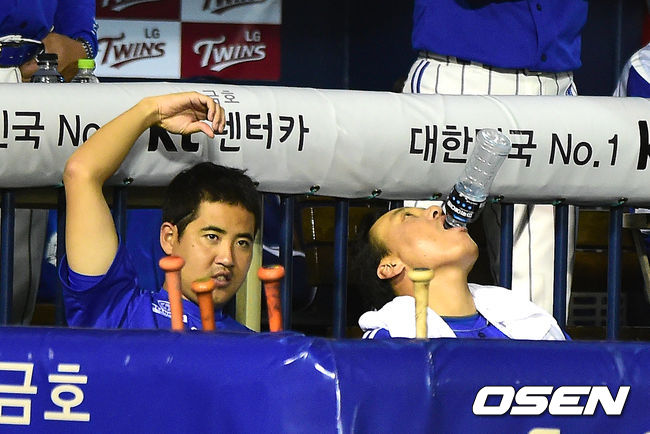 7회초 삼성 이승엽이 경기를 지켜보며 더그아웃에서 음료를 마시고 있다. 왼쪽은 장원삼.
