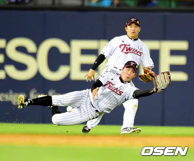 7회초 2사 3루에서 삼성 나바로의 타구를 LG 오지환과 정의윤이 놓치고 있다.