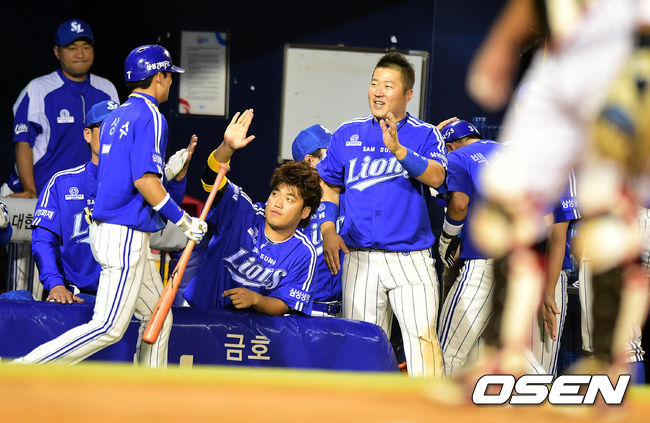 7회초 1사 2,3루에서 삼성 김상수가 좌익수 플라이를 날리고 동점에 성공하며 더그아웃에서 동료선수들과 하이파이브를 하고 있다.