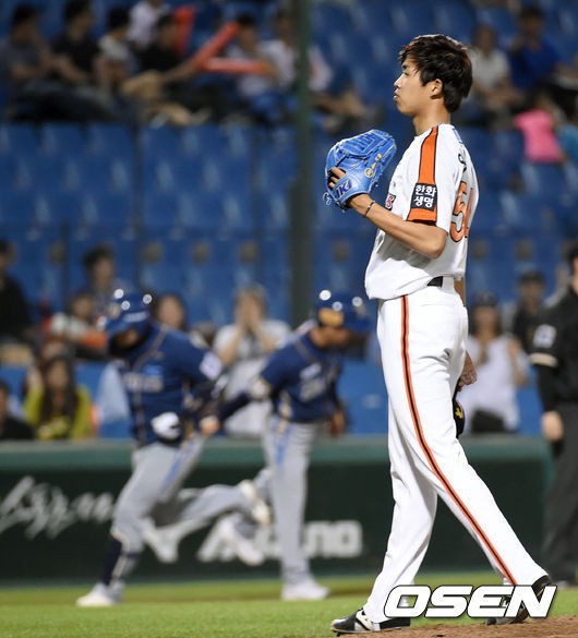 [OSEN=대전,김영민기자] 27일 오후 대전 한밭야구장에서 열린 '2014 한국야쿠르트 세븐 프로야구' 한화 이글즈와 NC 다이노스 경기, 7회초 2사 1루 한화 임기영 권희동에게 연타석 투런 홈런을 허용하며 아쉬워하고 있다.